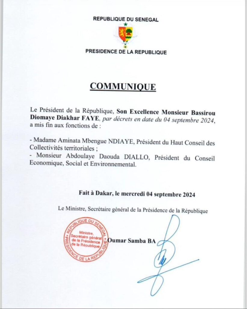C’est officiel. Comme annoncé par le Premier ministre Ousmane Sonko, le Président de la République Bassirou Diomaye Diakhar FAYE, « par décrets en date du 04 septembre 2024« , a mis fin aux fonctions de Mme Aminata Mbengue NDIAYE et de M. Abdoulaye Daouda Diallo, respectivement Présidents du Haut Conseil des Collectivités territoriales et du Conseil Economique, Social et Environnemental.