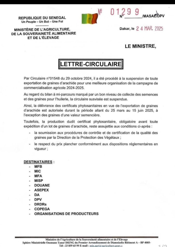 Les exportations seront autorisées du 25 mars au 15 juin 2025, à l’exception des graines à valeur semencière. Cependant, cette réouverture est soumise à plusieurs exigences : « contrôle qualité obligatoire par la Direction de la Protection des Végétaux, Respect du prix plancher fixé par les autorités, rapatriement des devises conformément à la réglementation des changes, Justificatifs exigés pour chaque nouvelle opération d’exportation. «