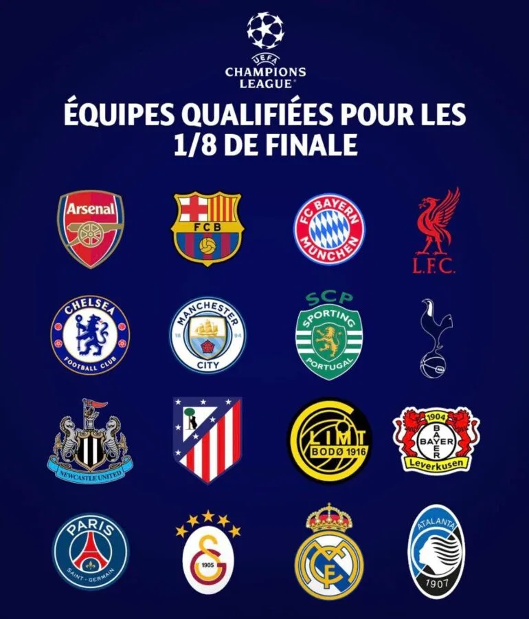 Arsenal FC • Atalanta  • Atlético de Madrid • Bayer Leverkusen • FC Bayern Munich • Bodø/Glimt • Chelsea FC • FC Barcelone • Galatasaray SK • Liverpool FC • Manchester City • Newcastle United • Paris Saint-Germain • Real Madrid • Sporting CP • Tottenham Hotspur