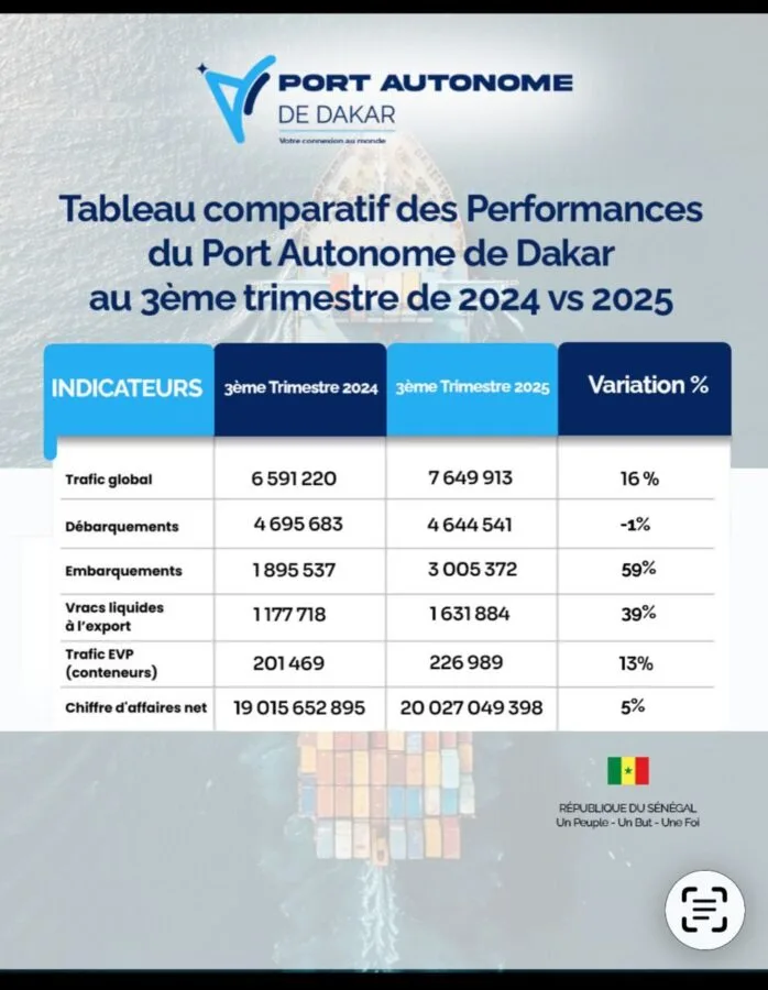 Le Port autonome de Dakar (Pad) confirme sa dynamique de croissance. Au troisième trimestre 2025, son chiffre d’affaires net a franchi le cap des 20,02 milliards F CFA, en progression de 5 % par rapport à la même période de 2024 (19,01 milliards F CFA).