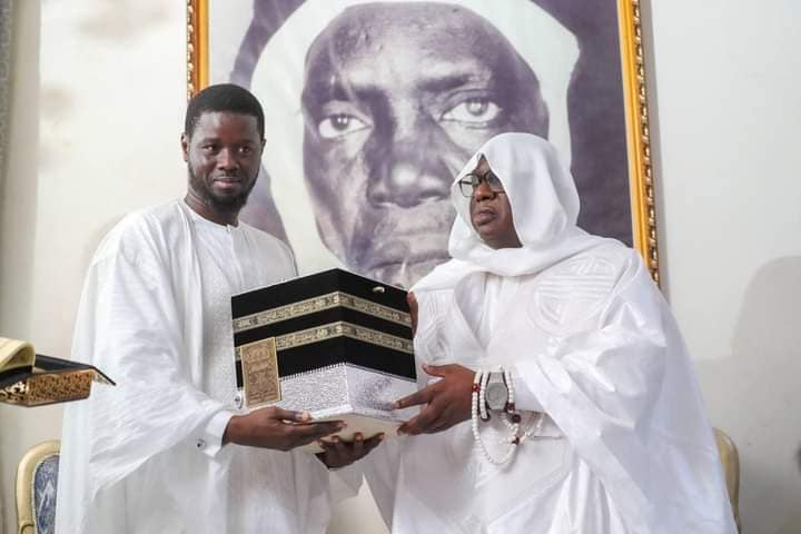 Visite à Yoff : les précieux cadeaux du khalife général Serigne Mouhamadou Makhtar Laye au Président de la République Bassirou Diomaye Faye Un exemplaire unique du Saint Coran accompagné d’un support orné de la « Kaaba ».